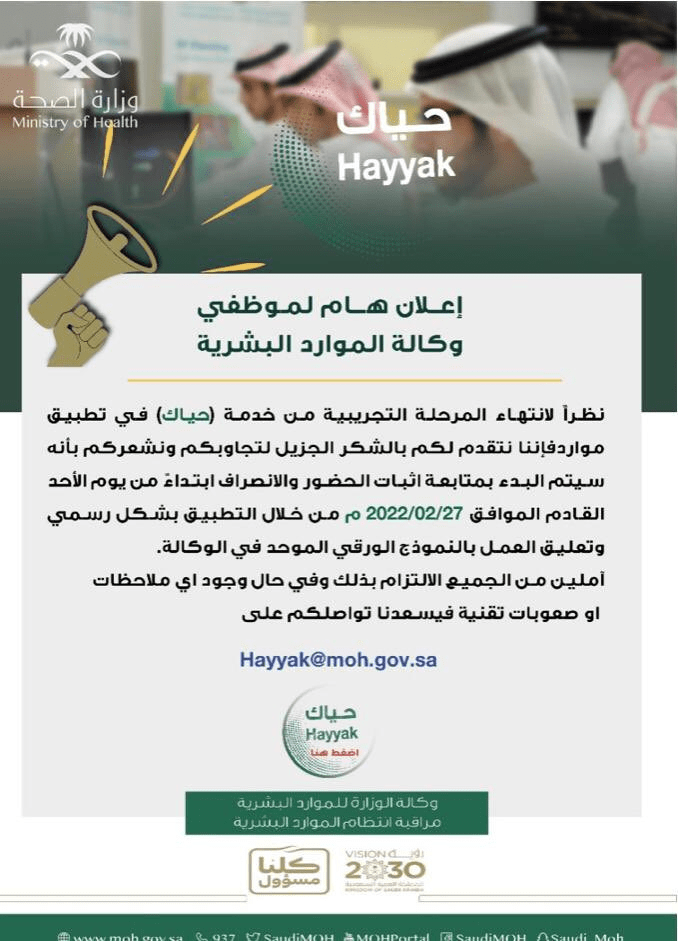 للأسف برنامج حياك يحتاج مراجعة وكل يوم معلق ويحسب الخير رغم انه معلق ولا يمكن الموظف من تسجيل الدخول …