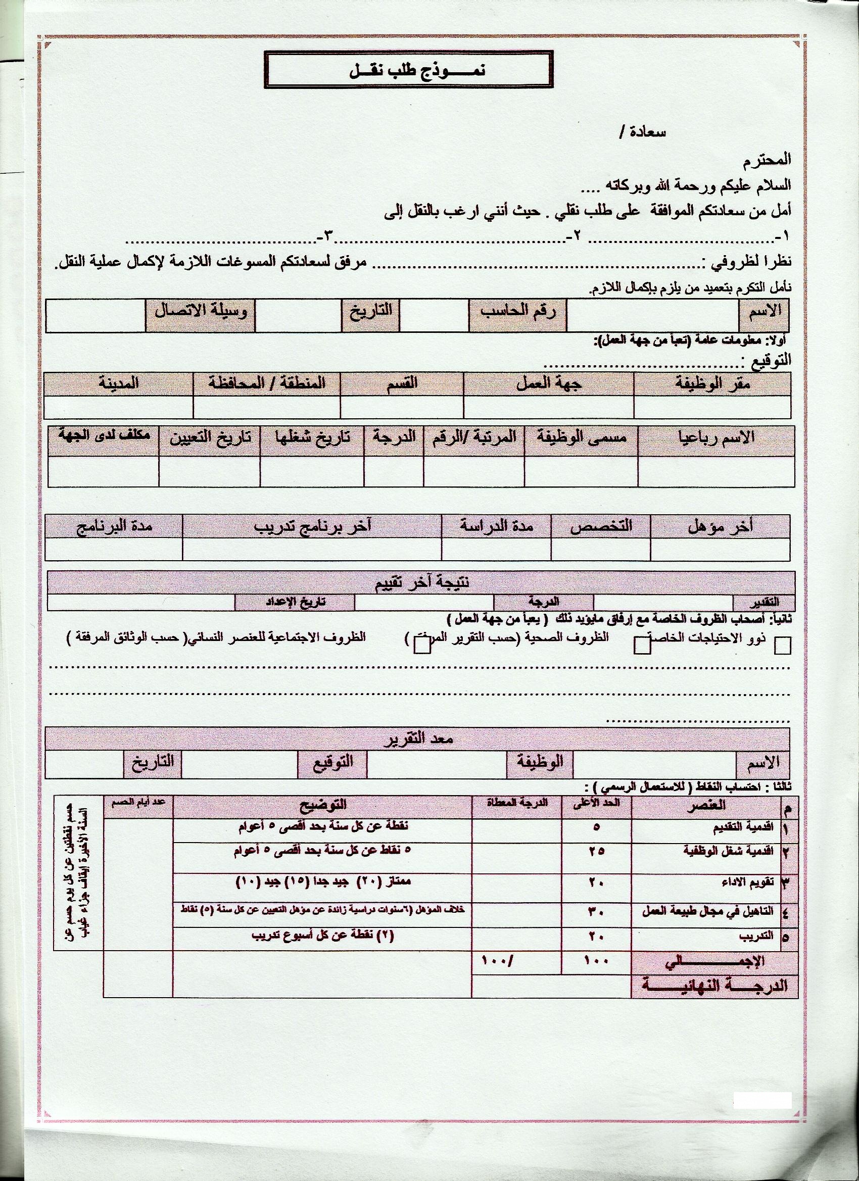 المقيم معها في المنطقة التي تعمل بها، والنقل او الترقية للزوج او المحرم من المنطقة التي يقيم معها بها بالنسبة للزوجين العاملين في الوزارة، وزوجات العسكريين الذين يتم تحريكهم بشكل عاجل في ظروف استثنائية في بعض المناطق. كما تضمنت الآلية الجديدة للنقل بأن تقوم كل منطقة صحية بانشاء لجنة للنظر في طلبات النقل وتشتمل في عضويتها على عضو من إدارة شؤون الموظفين،والإدارة القانونية، والرقابة الداخلية، والمتابعة، وتكون برئاسة مدير الشؤون الصحية على أن لا يرتبط نقل أصحاب الظروف بحركة النقل. كما تم تكليف المناطق بمتابعة وتسجيل مباشرات الموظفين المنقولين لمهام الوظائف المنقول إليها كل منهم في مقرها مباشرة فعلية في مدة أقصاها 15 يومًا من تاريخ صدور قرار النقل، مع إنشاء لجنة بالوزارة للنظرفي التظلمات التي قد تنشأ بعد صدور قرارات النقل،
